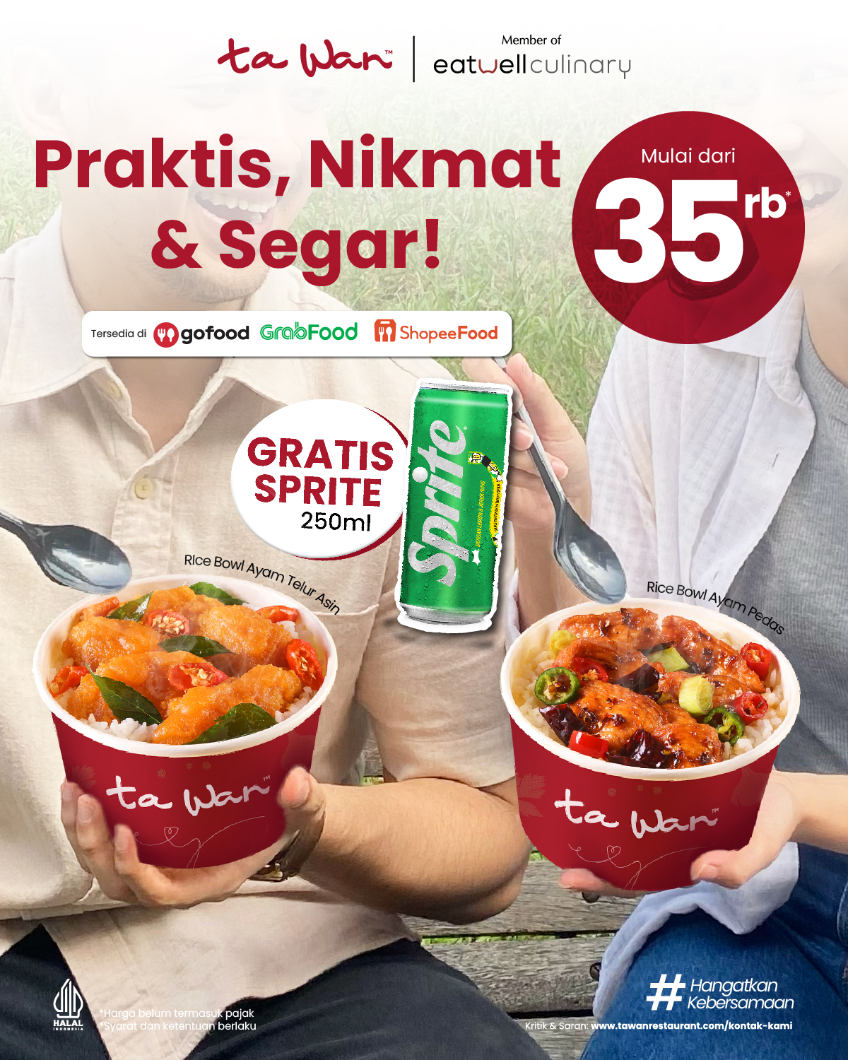 Kamu masih bisa nikmati perpaduan rasa lezat dan kesegaran dalam satu paket praktis. Setiap pembelian Rice Bowl Ta Wan melalui aplikasi pesan antar favorit, kamu akan mendapatkan Sprite 250ml secara gratis.