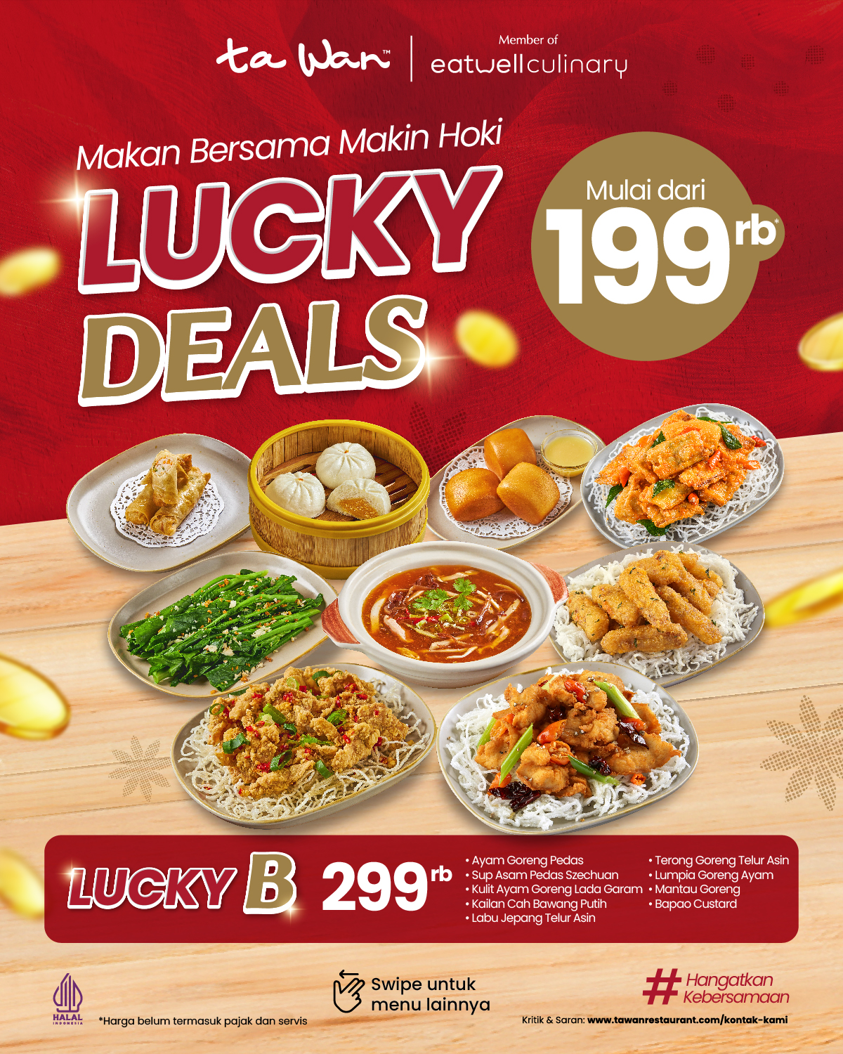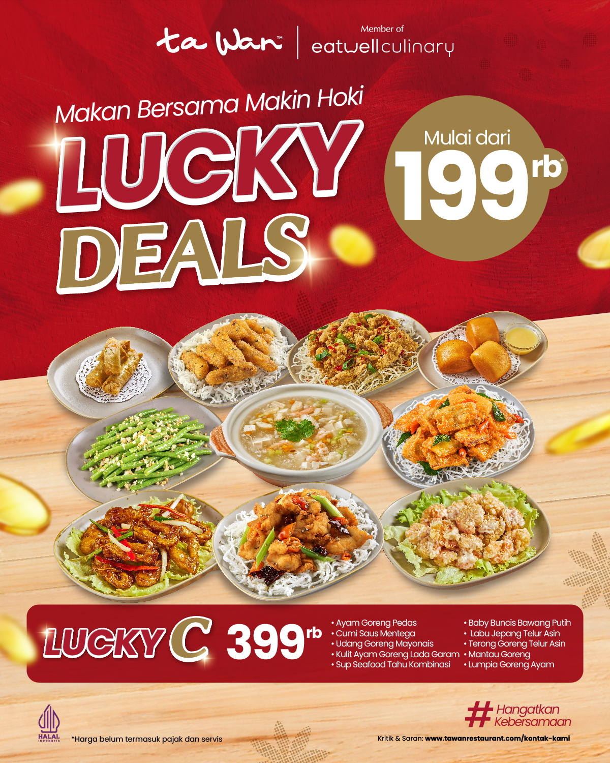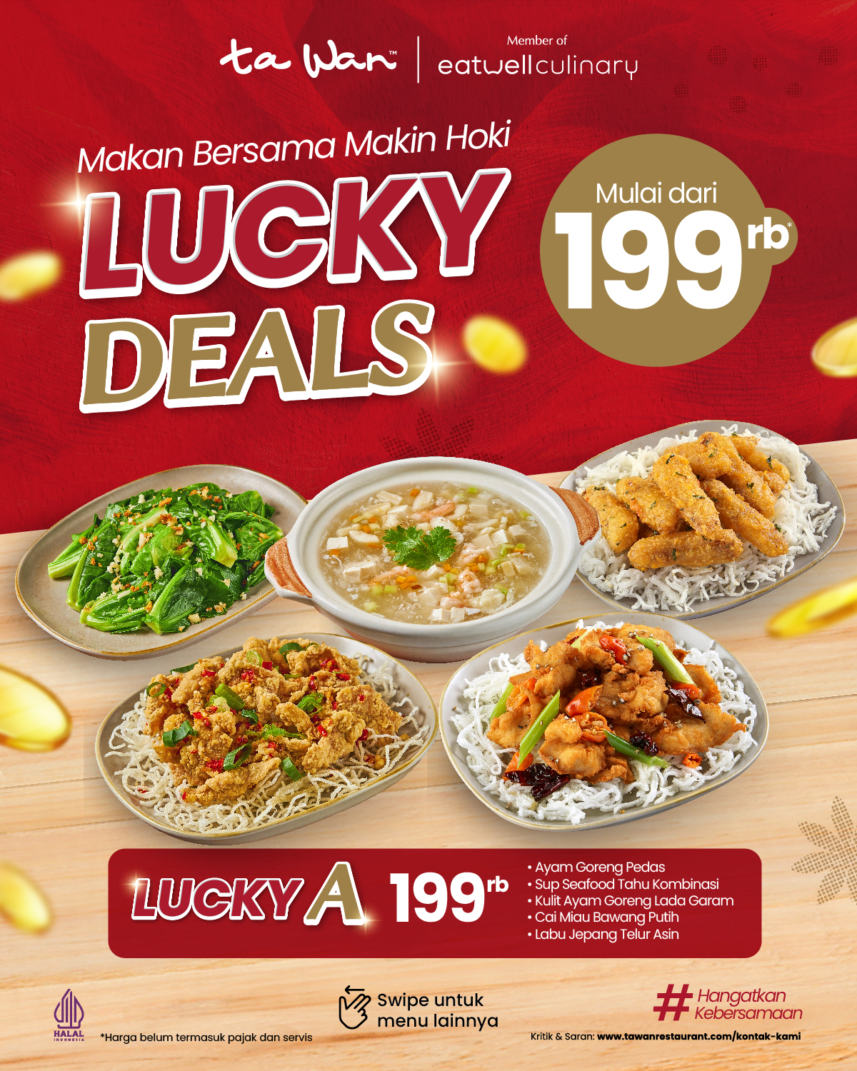 Bagi kami, momen berkumpul bersama orang tersayang sambil menikmati hidangan lezat adalah sebuah keberuntungan. Untuk menghadirkan suasana yang lebih hangat dan penuh makna, Ta Wan hadir dengan Lucky Deals.
