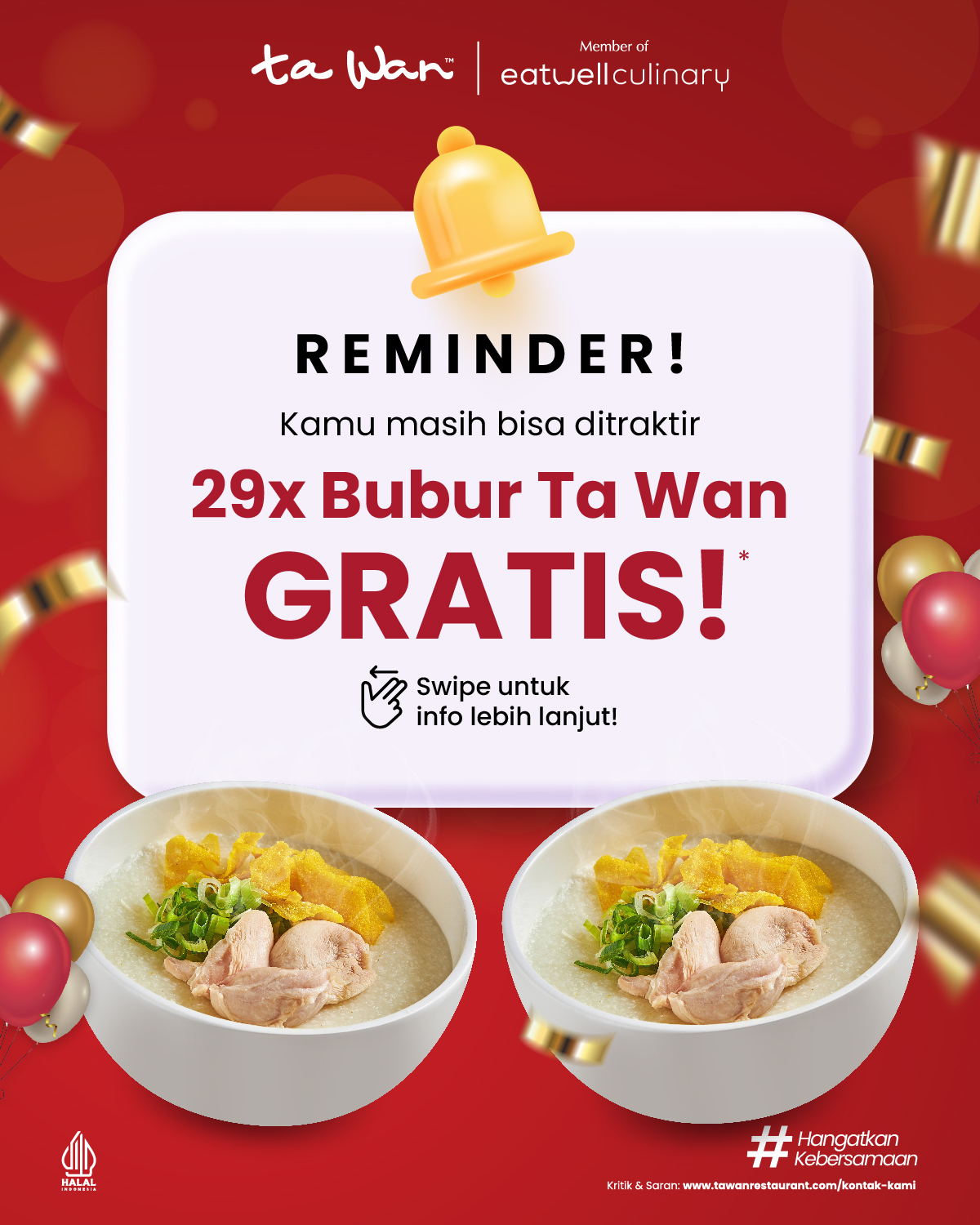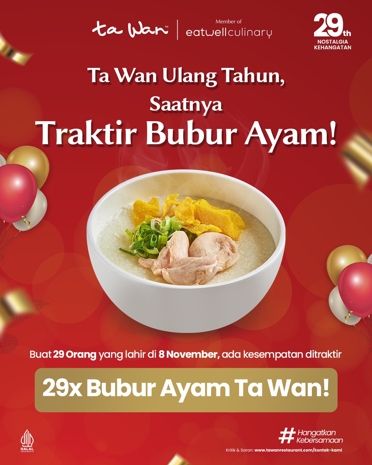 Tenang, untukmu yang lahir di 8 November, ada traktiran 29x Bubur Ayam Ta Wan GRATIS. Ikuti langkah berikut: